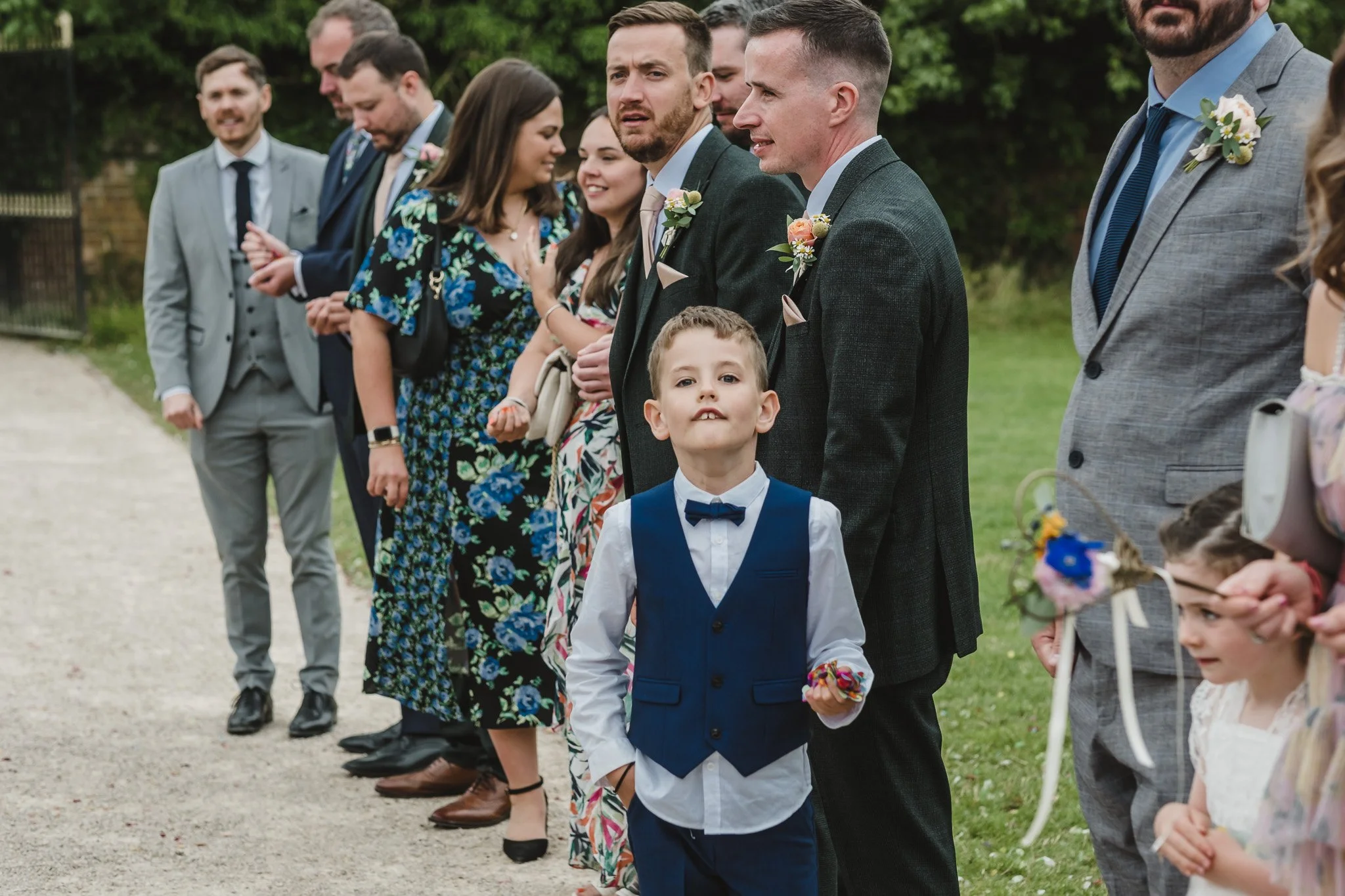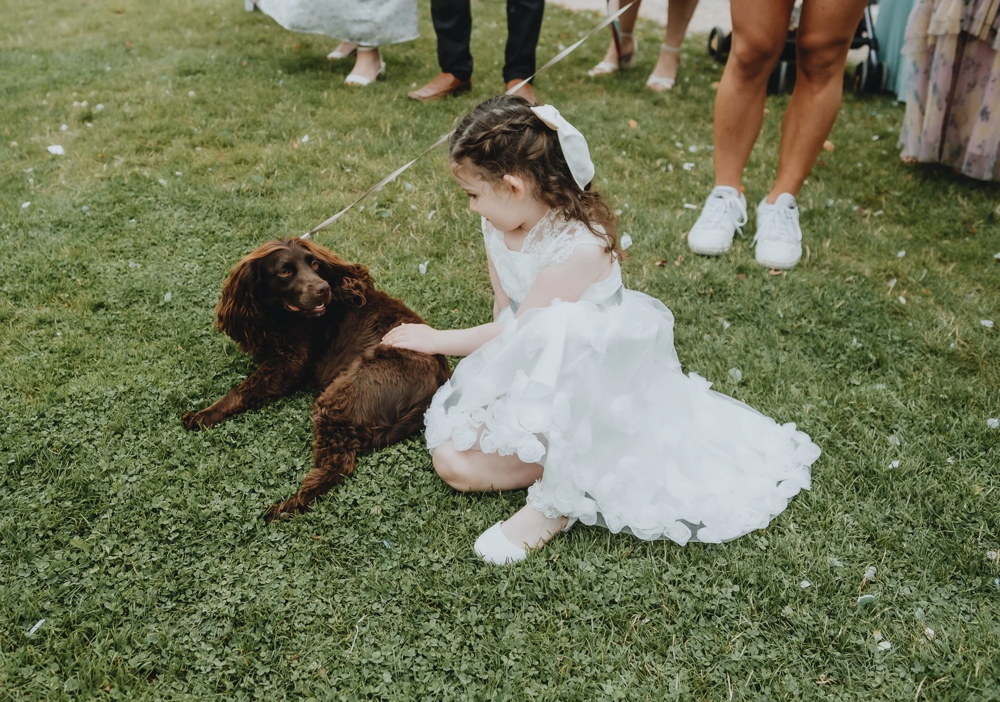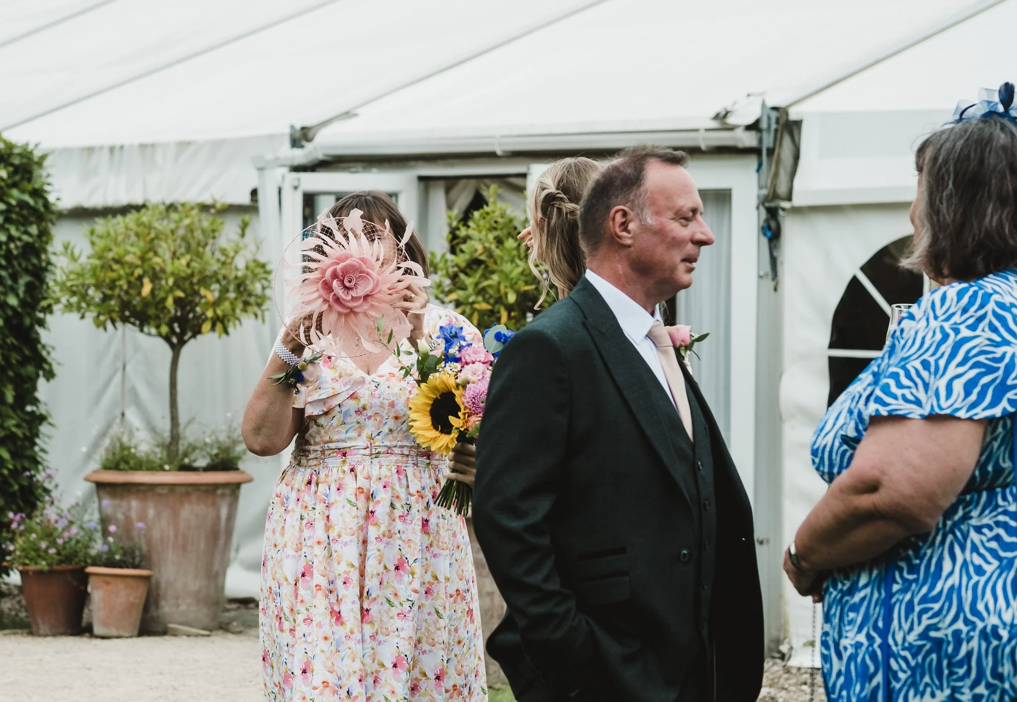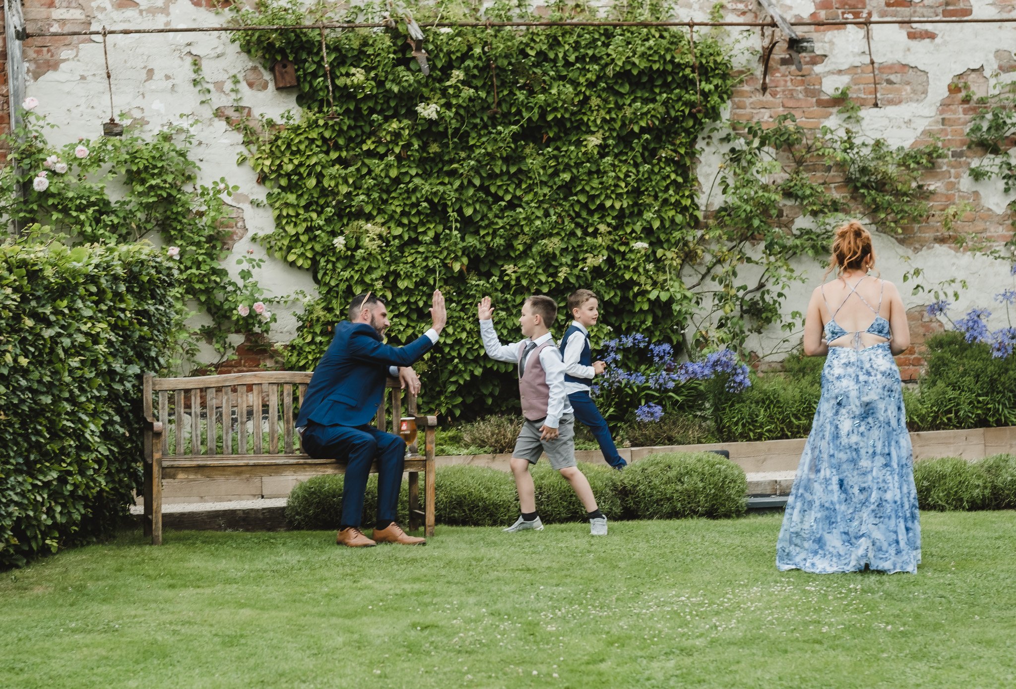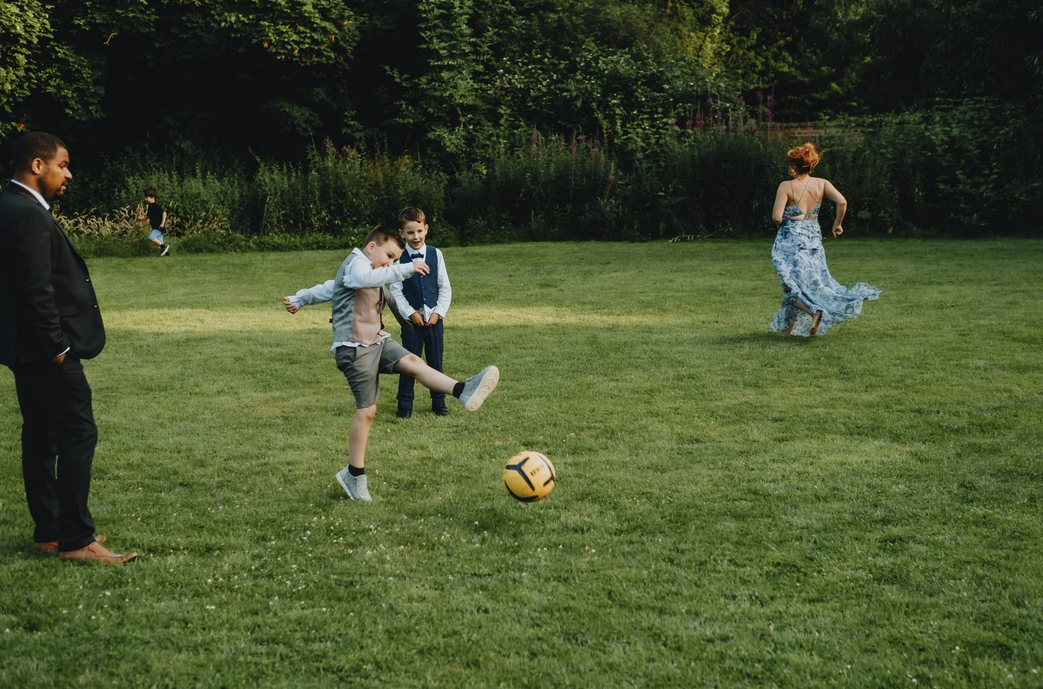 Guests arrived slowly, soaking up the July sunshine, and the couple’s spaniel made a cheerful appearance to say hello (expertly supervised by a friend). Meanwhile, children claimed the front lawn for an enthusiastic game of football, joyful chaos in the best way.
