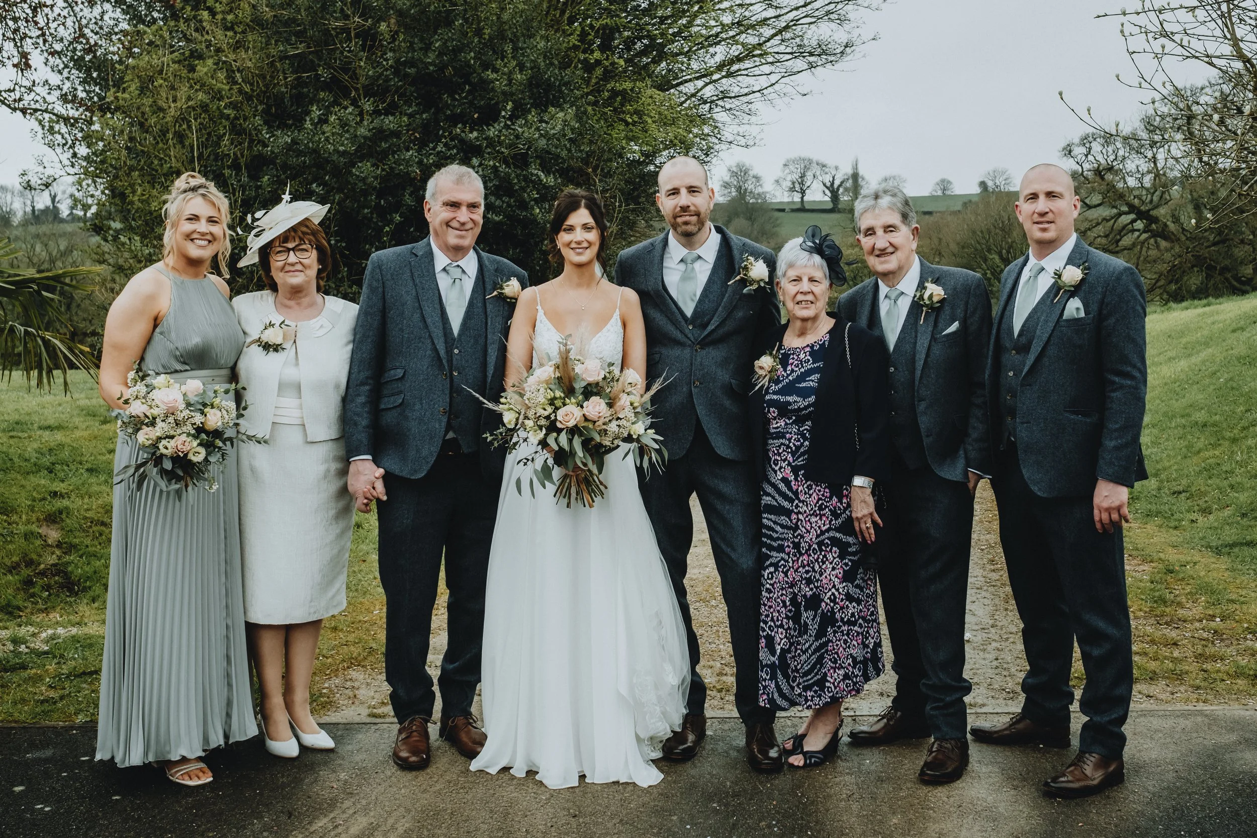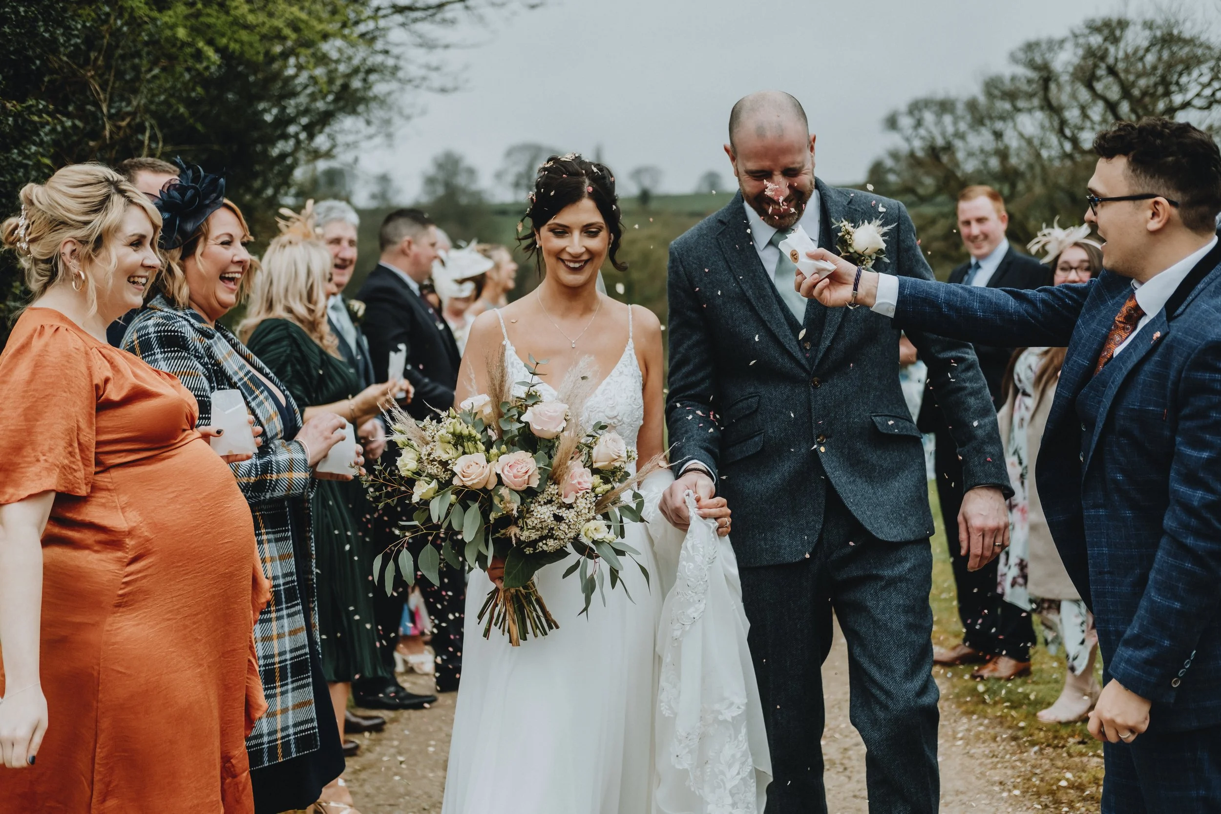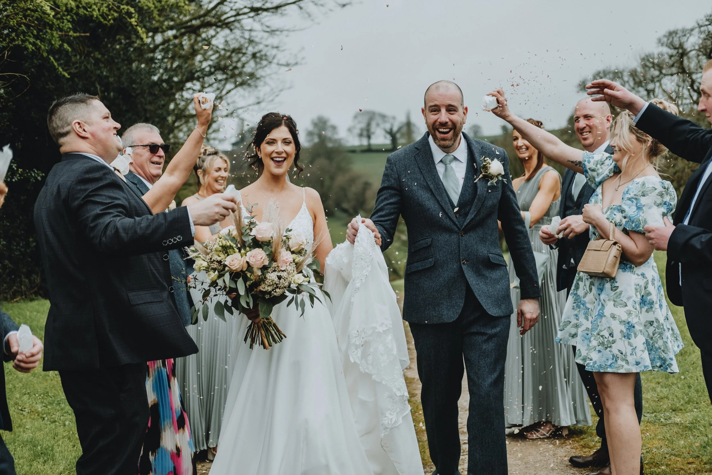 Just before the rain began, we were able to enjoy outdoor confetti—a moment full of smiles and happy tears. We also managed to complete all the family portraits outside, making the most of the soft light before heading indoors for canapés and mingling. This was the perfect time for the bride and groom to greet their nearest and dearest, with more guests joining the celebration later in the day.