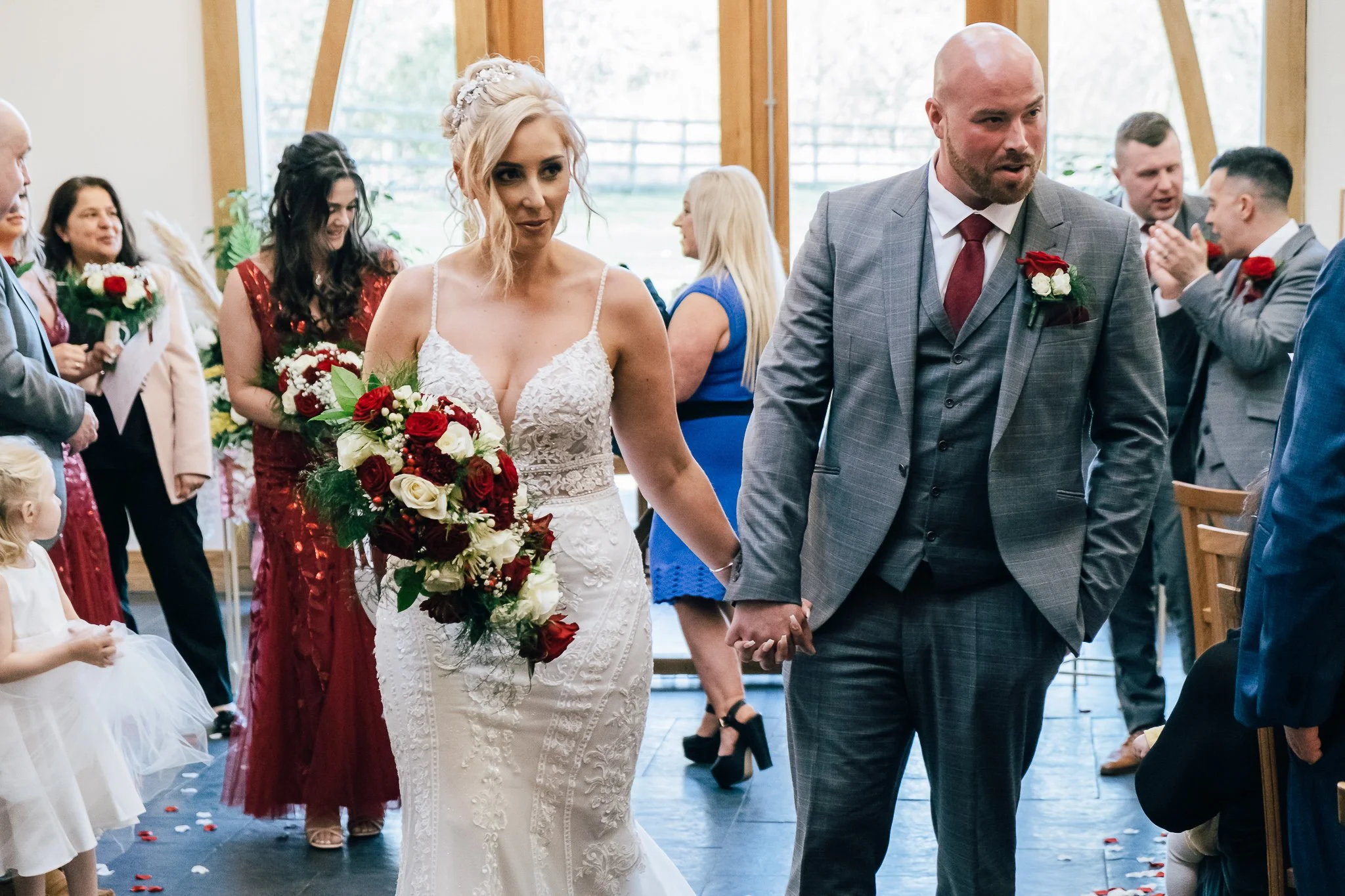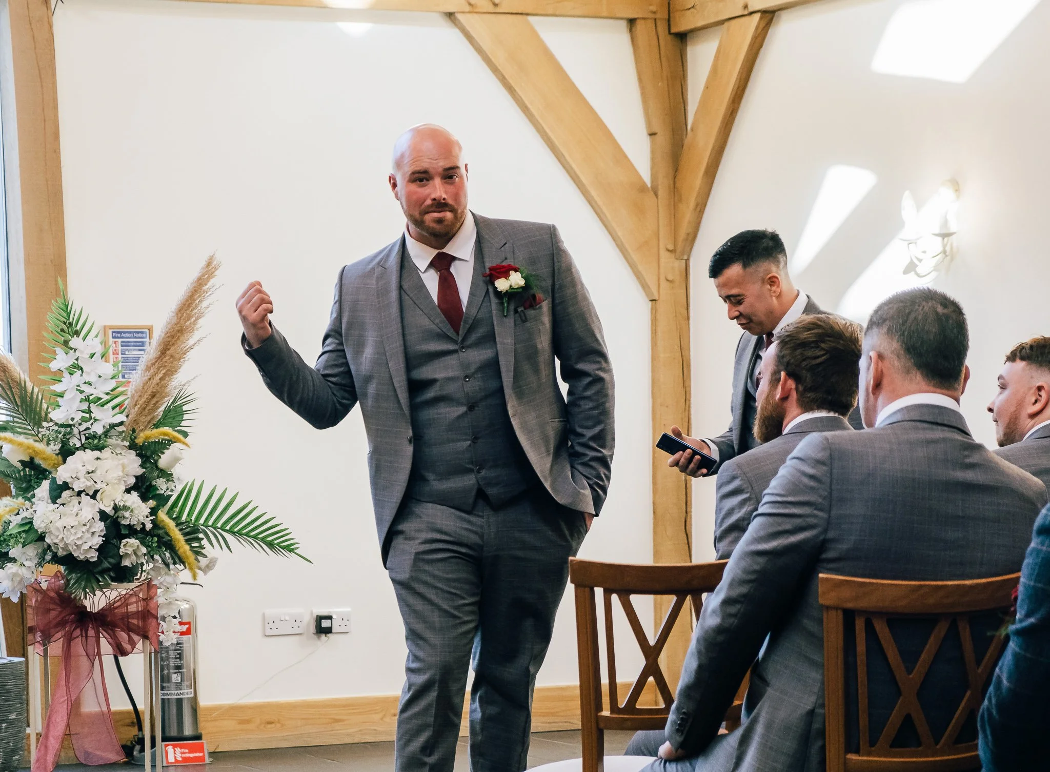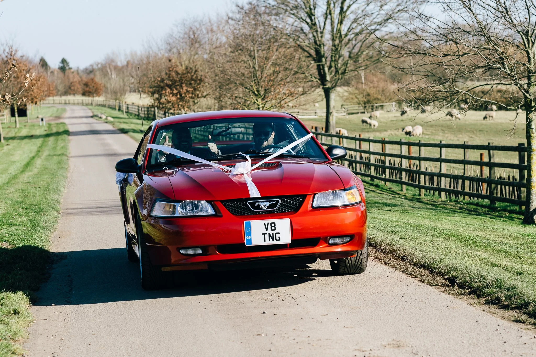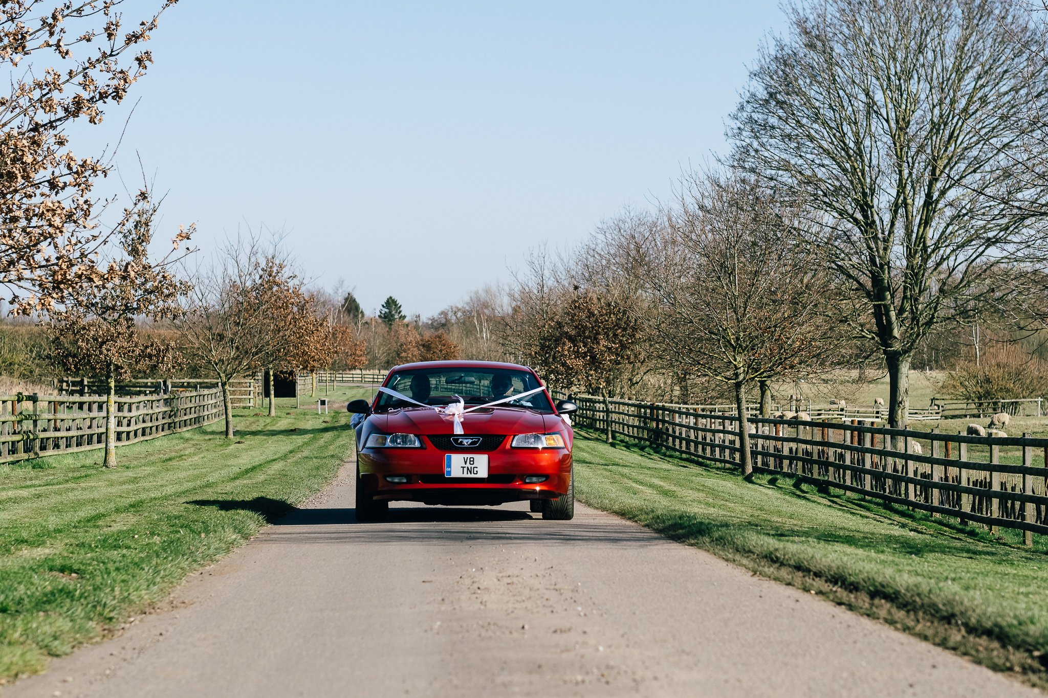 The day was brimming with joy and excitement, setting the perfect tone for a special celebration. One standout feature was the vibrant red Mustang in which the groom arrived in style, a striking contrast to the rustic barn and countryside scenery, immediately signalling a day full of personality.