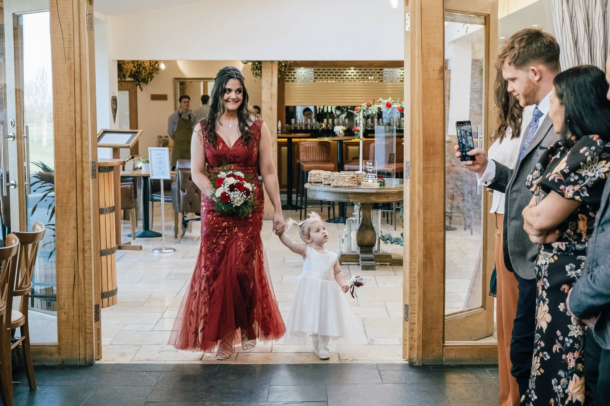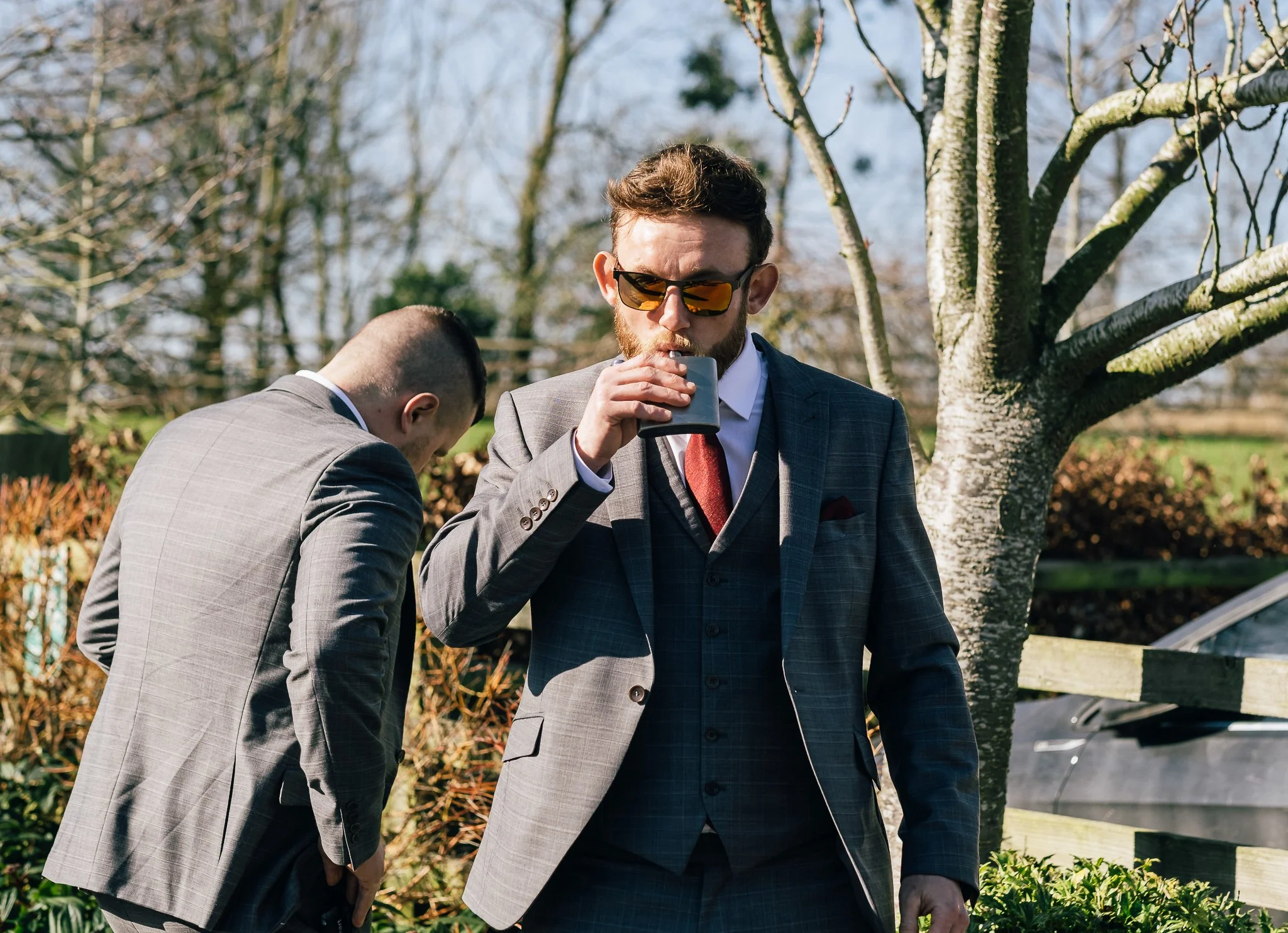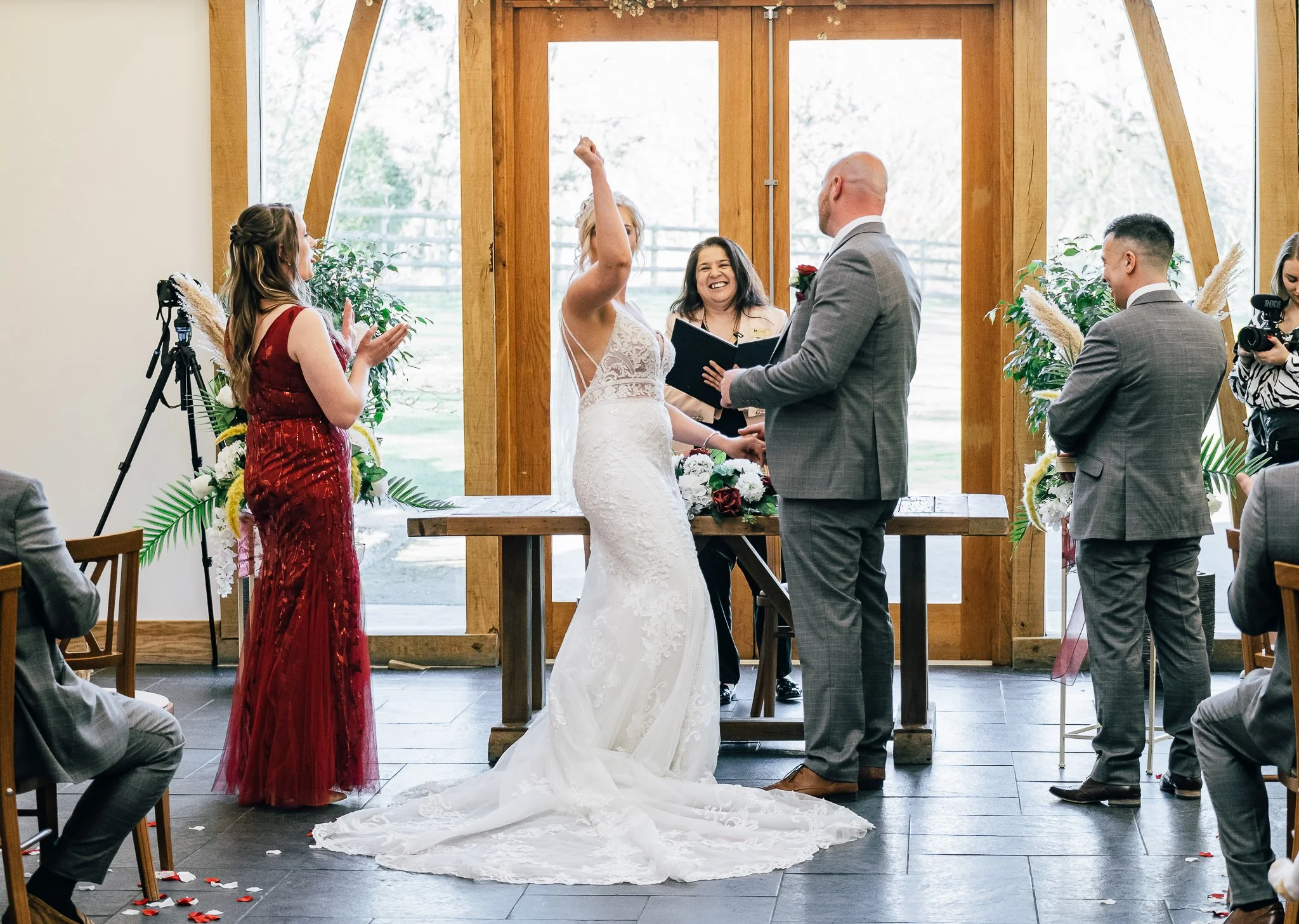 The day was brimming with joy and excitement, setting the perfect tone for a special celebration. One standout feature was the vibrant red Mustang in which the groom arrived in style, a striking contrast to the rustic barn and countryside scenery, immediately signalling a day full of personality.