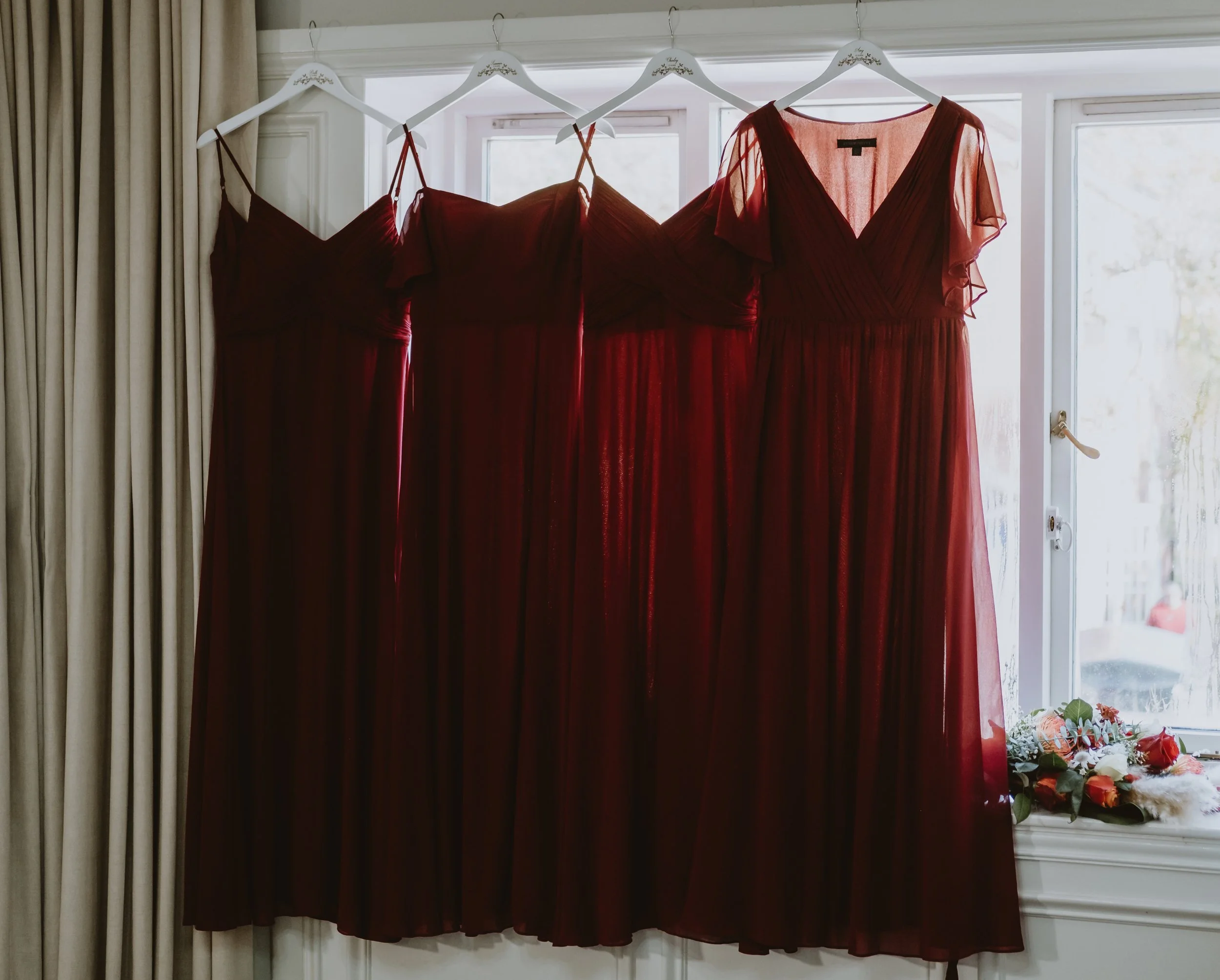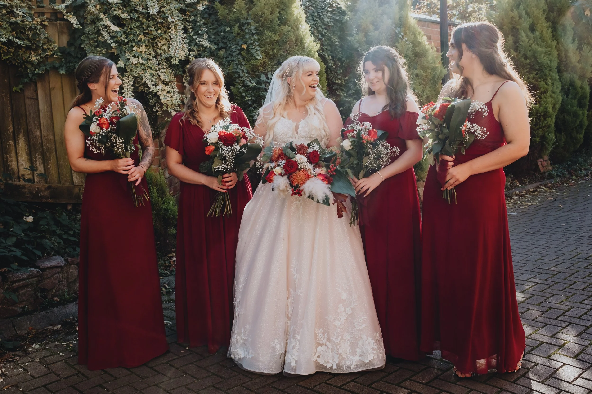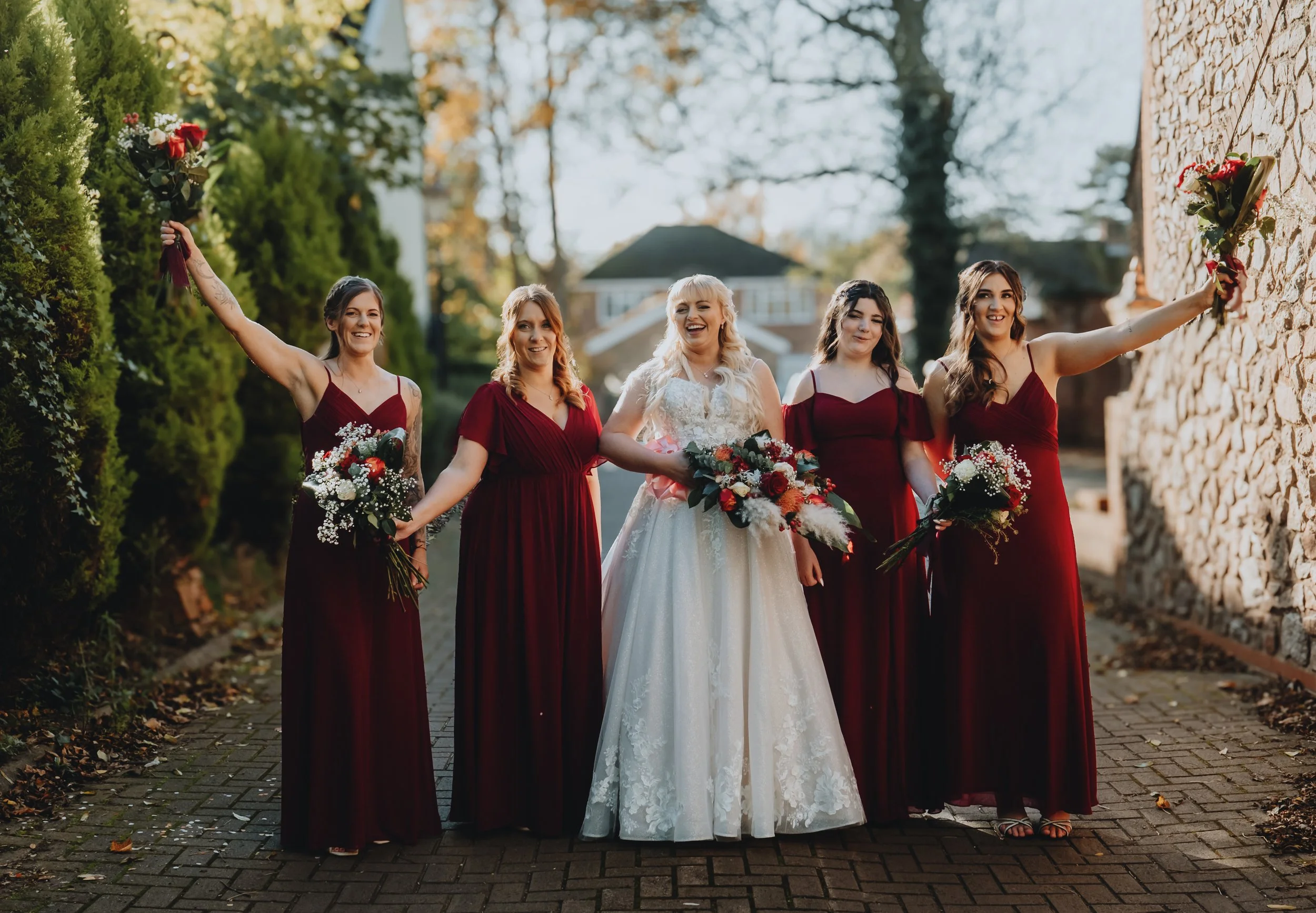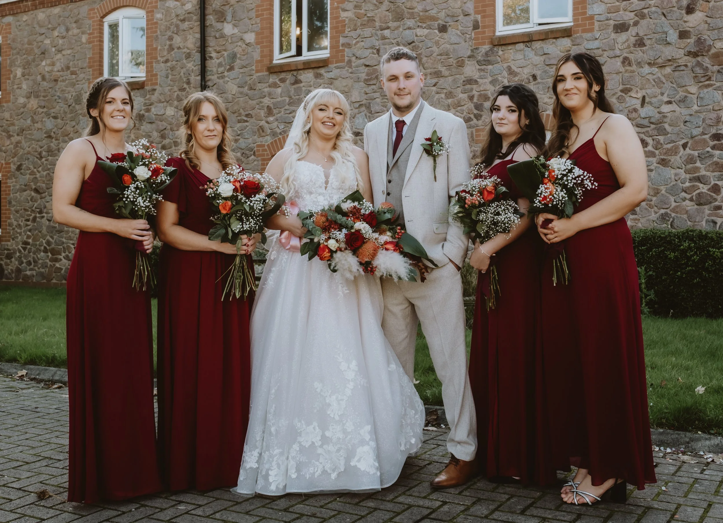 Josh wore a beige suit with burgundy accessories, which worked perfectly for the season, while the bridesmaids wore elegant long burgundy dresses.