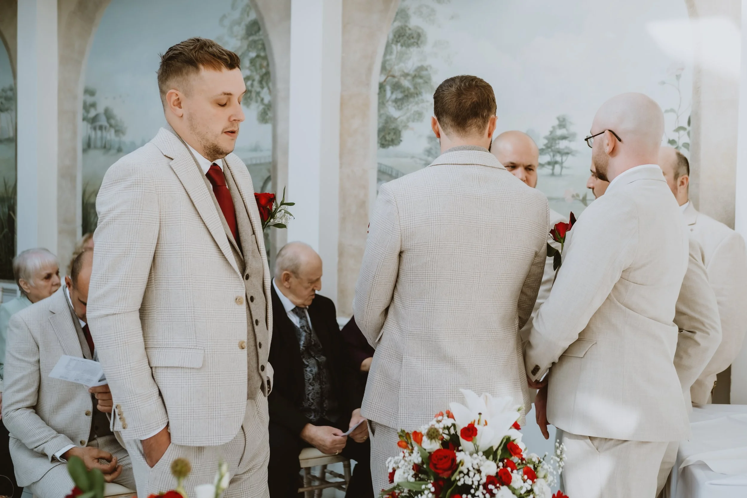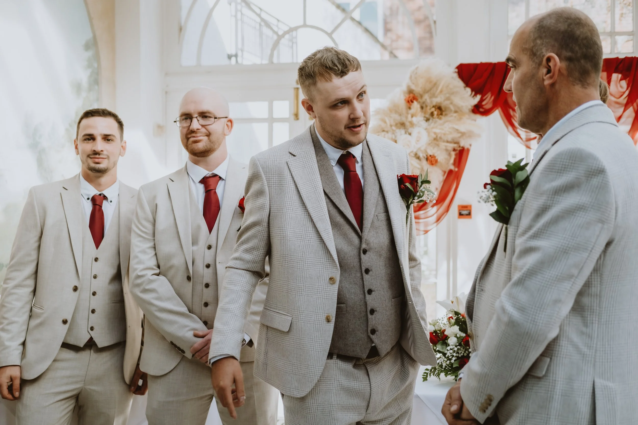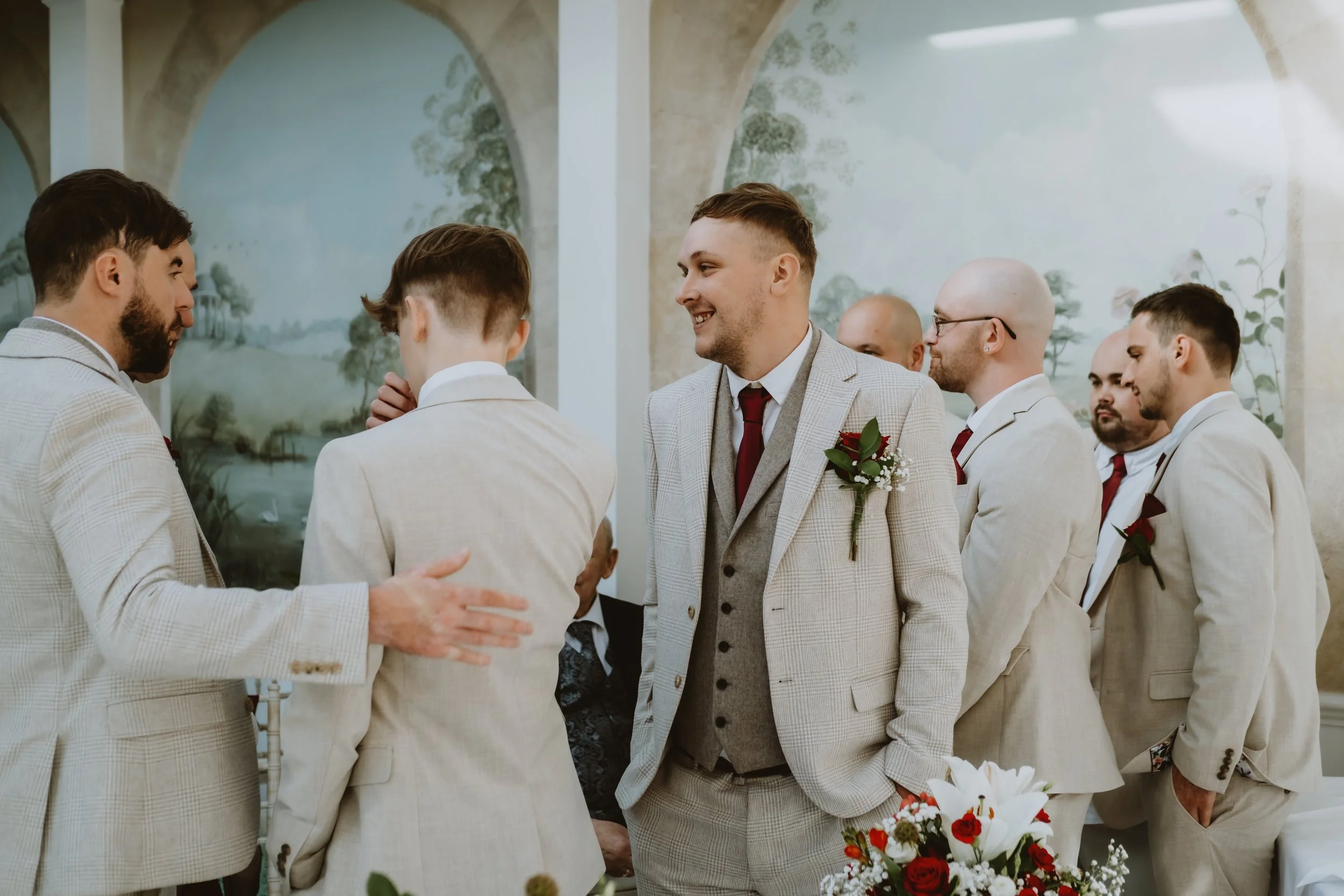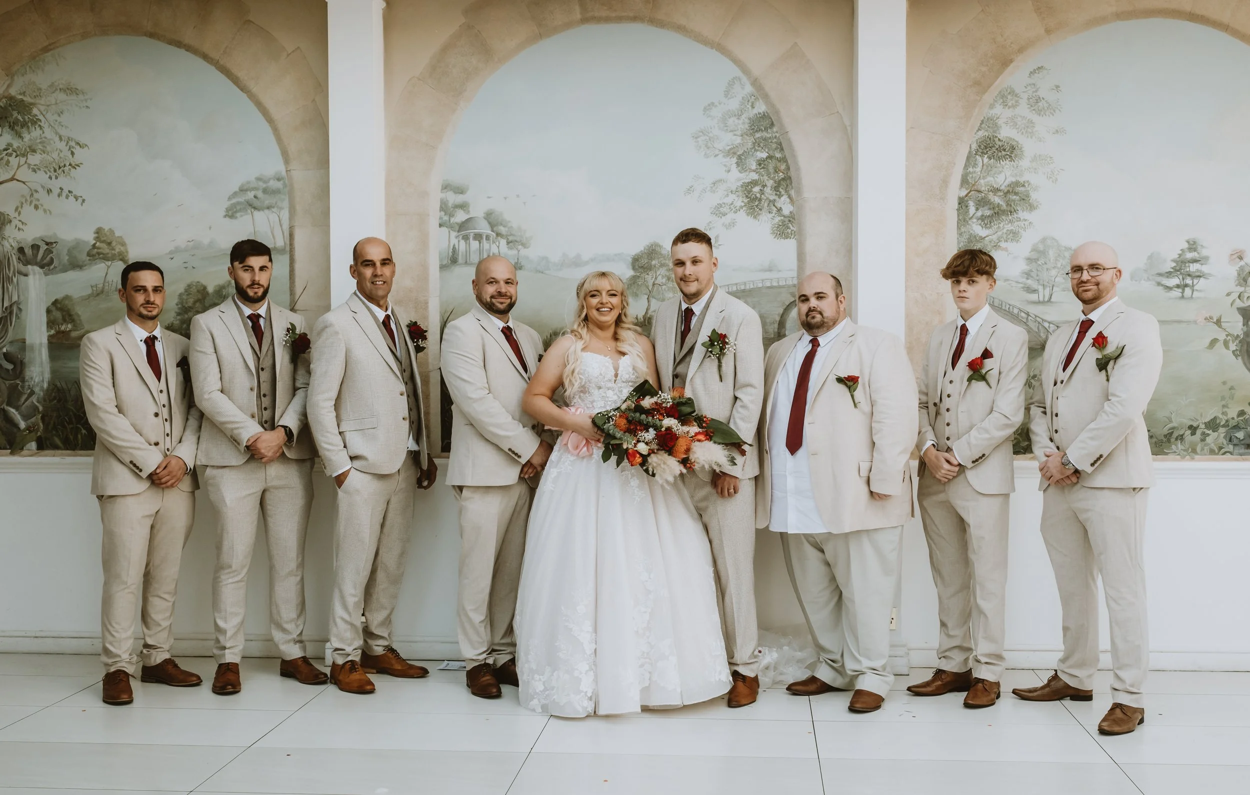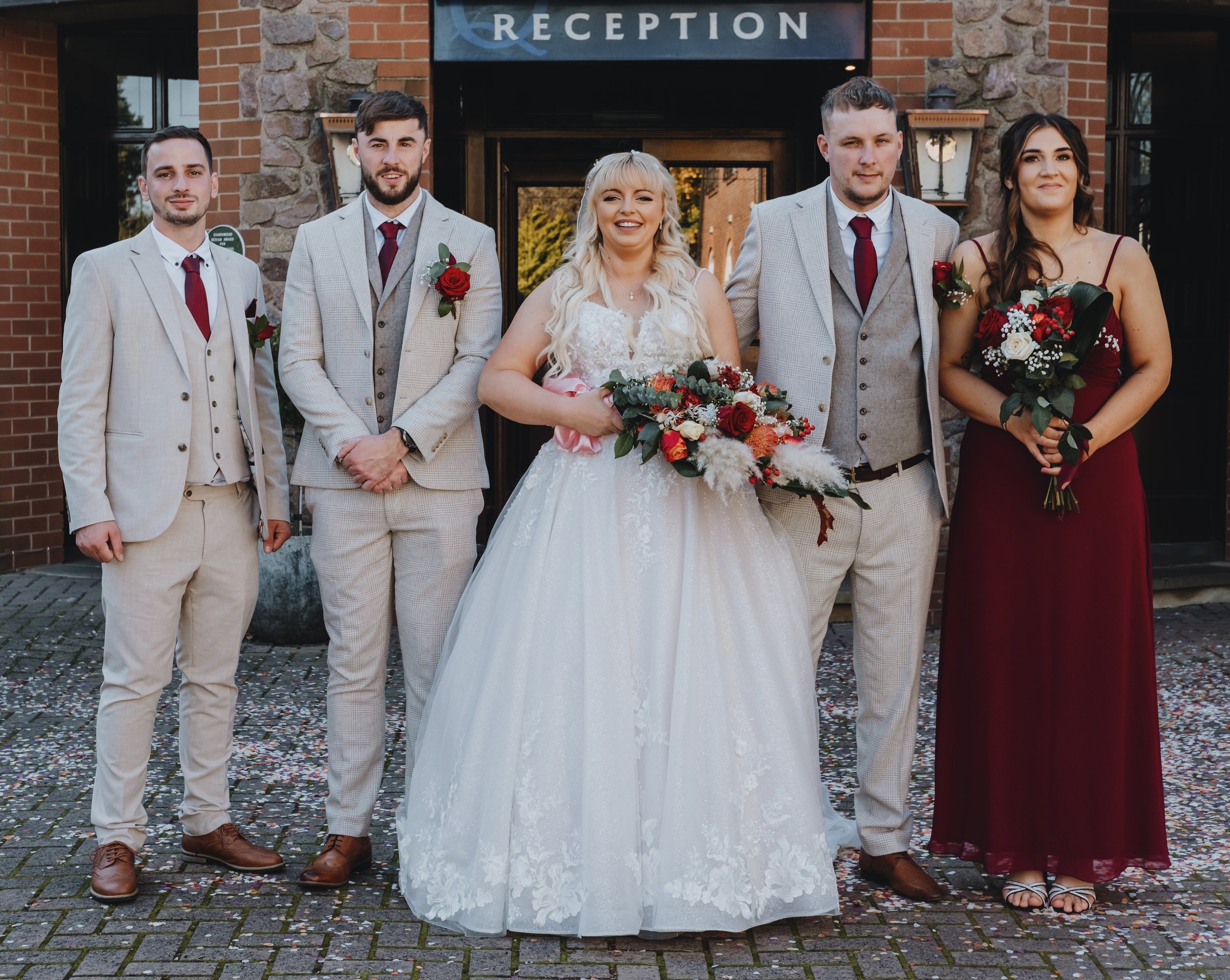 Josh wore a beige suit with burgundy accessories, which worked perfectly for the season, while the bridesmaids wore elegant long burgundy dresses.