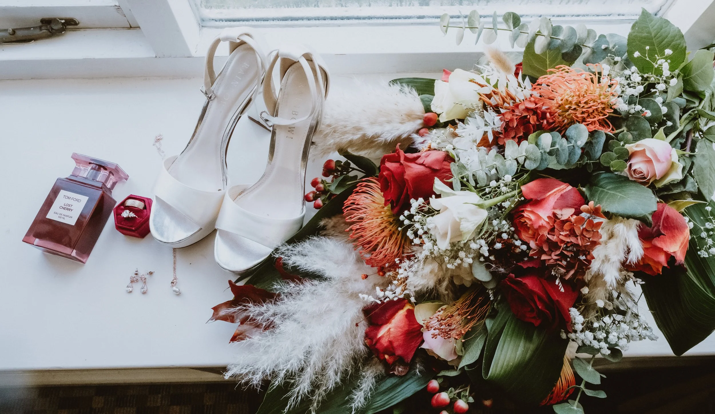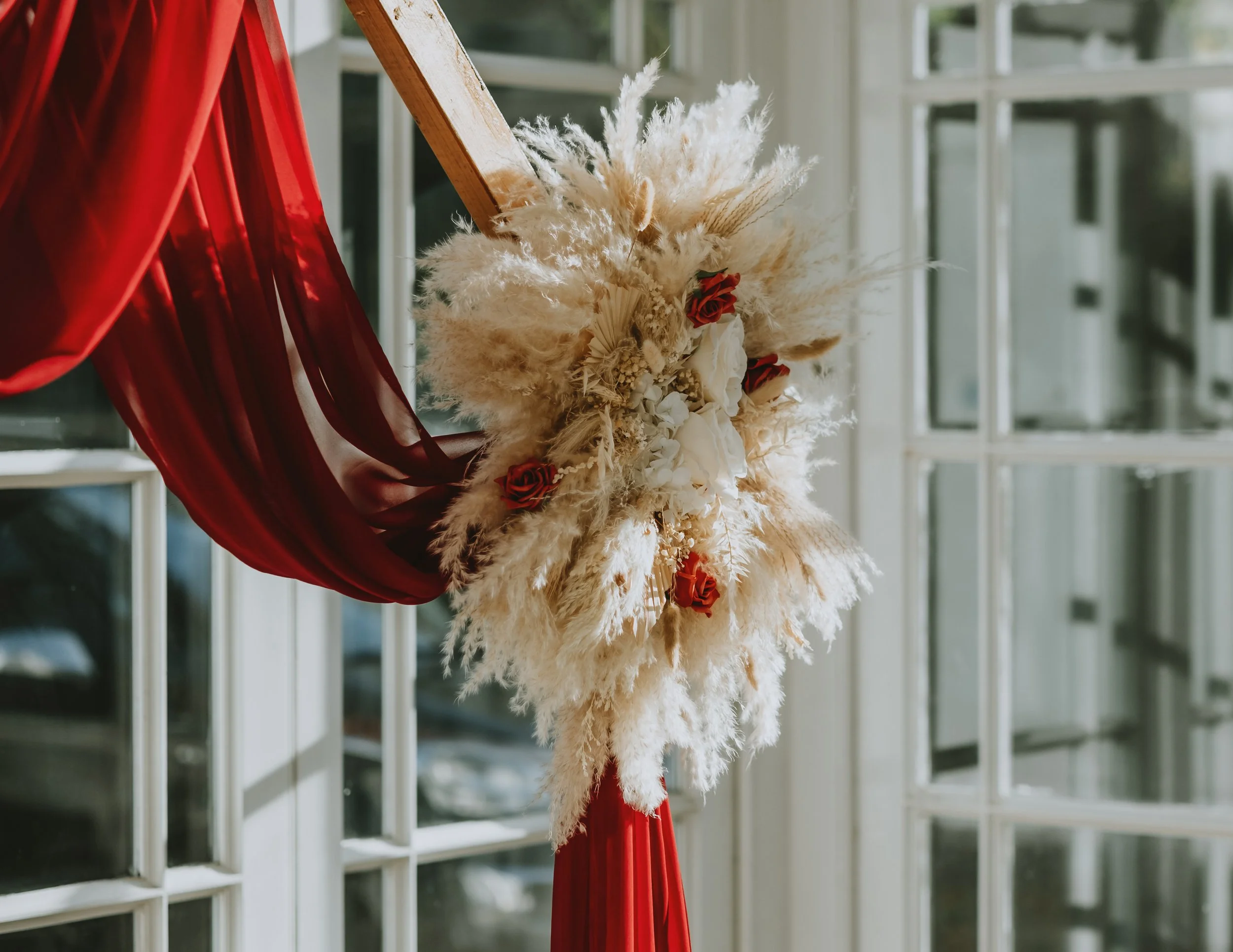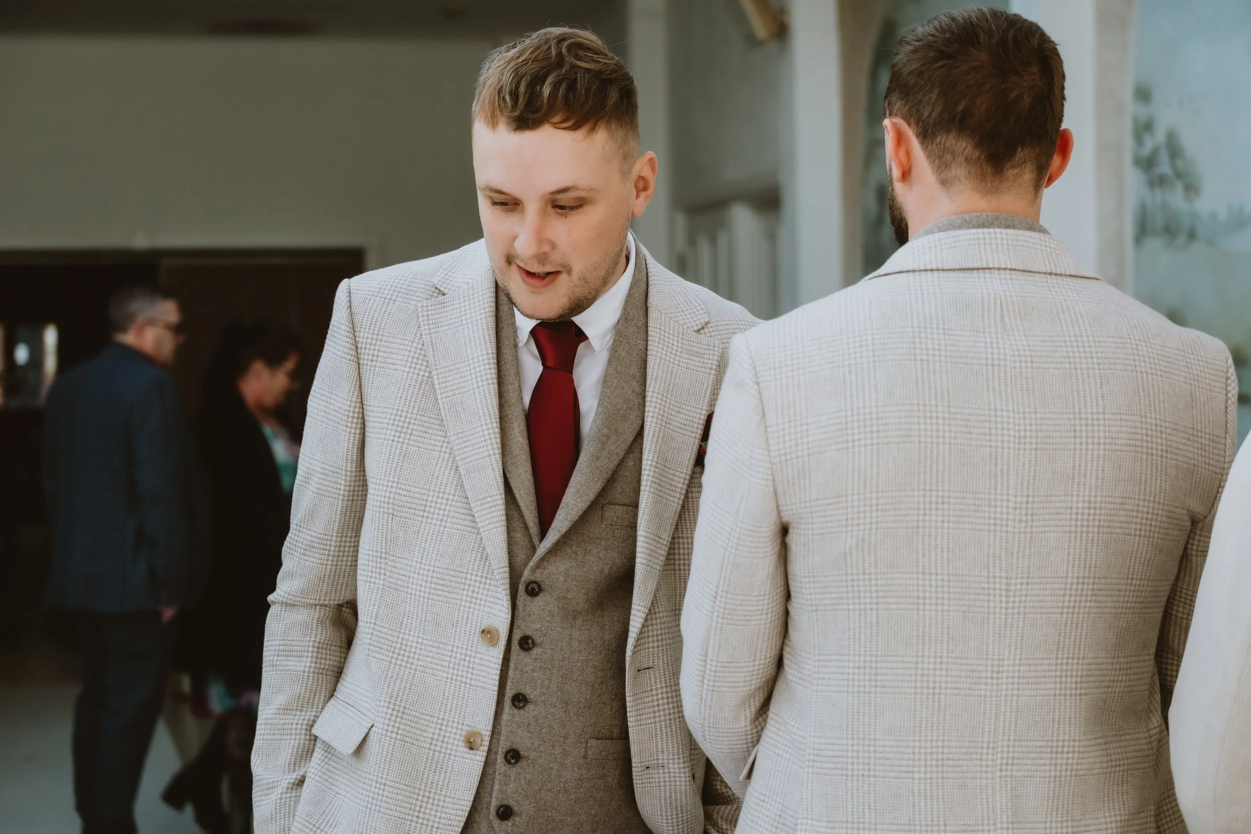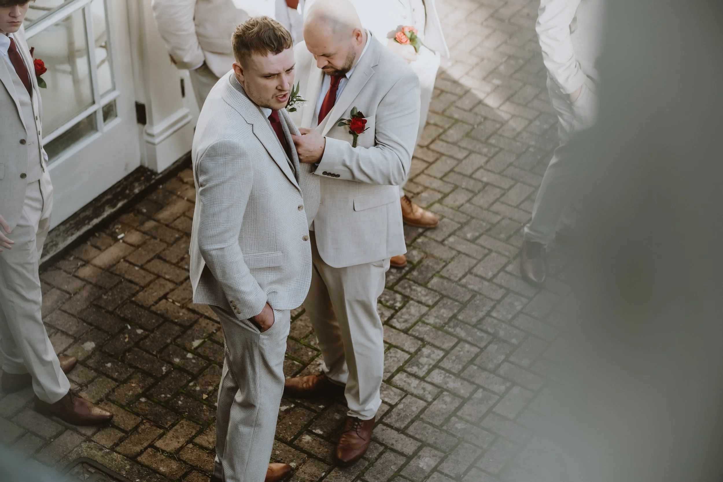 Josh wore a beige suit with burgundy accessories, which worked perfectly for the season, while the bridesmaids wore elegant long burgundy dresses.